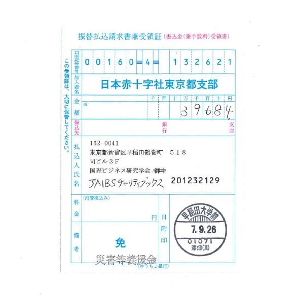 JAIBSチャリティー・ブックスにつきまして、活動収益(39,684円)を日本赤十字社へ寄付しましたことを以下にご報告いたします。